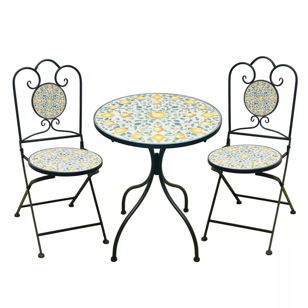 LEMONIA fém kerti garnitúra mozaikkal: 60x60 cm asztal, 2 összecsukható szék. Dekoratív mozaik lap, masszív kivitel.